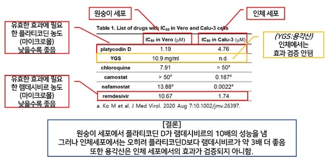 그러나 결론만 말씀드리겠습니다. 도라지 성분인 플라티코딘 D는 시험관에서 어느정도 효과가 있었을지는 모르나, 용각산은 인체 세포에서는 아예 효과가 검증되지 않았습니다.