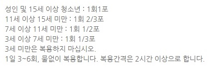 소아 1회 : 8~14세 : 0.2g(2/3스푼), 5~7세 : 0.1g(1/3스푼)
