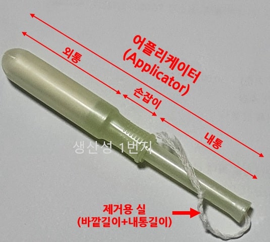 붙투명한 어플리케이터 윗부분에 들어 있는 하얀 솜 뭉치가 바로 흡수체입니다. 어플리케이터를 이용해서 이 흡수체를 질 속에 삽입하여 생리혈을 빨아들이는 원리입니다. 즉 어플리케이터는 일회용인 것이죠. 밑에 있는 실은 사용 후 잡아당겨 흡수체를 제거 할 때 사용됩니다.